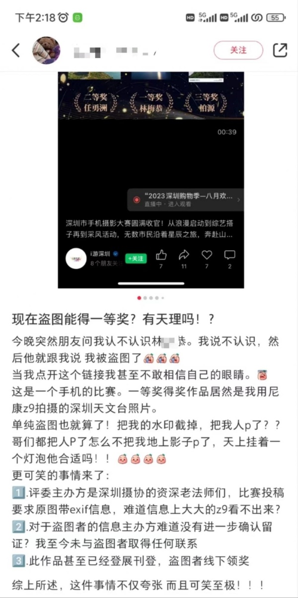 胡先生表示,前几天有朋友问他是否认识一个叫做“林某恭”的人,并告诉他拍摄的照片被盗图了,而且已经获奖了。胡先生发现,这是一个手机摄影比赛,一等奖作品是他用尼康Z9相机拍摄的深圳天文台照片。22日,他告诉上游新闻(报料邮箱[email protected])记者,照片是7月9日拍的,拍完就发在朋友圈和一些微信群聊里面,并未报名参赛,结果被不明身份者盗图之后参加了这次手机摄影大赛。“单纯盗图也就算了!把我的水印截掉,把我人P了?哥们儿都把人P了怎么不把我地上影子P了,天上挂着一个吊灯他合适吗?”胡先生在帖子里愤怒地表示。