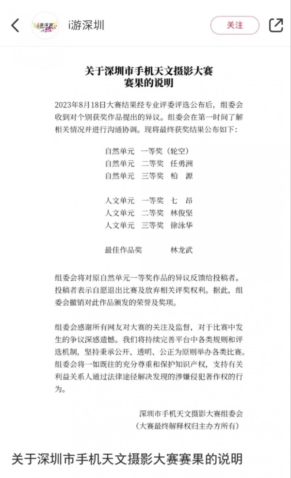 21日下午,认证为“深圳旅游官方宣传推广平台”的账号“i游深圳”在某社交平台发布《关于深圳市手机天文摄影大赛赛果的说明》,“2023年8月18日大赛结果经专业评委评选公布后,组委会收到对个别获奖作品提出的异议。组委会将对原自然单元一等奖的异议反馈给投稿者,投稿者表示自愿退出比赛及放弃相关评奖权利。据此,组委会撤销对此作品颁发的荣誉及奖项。组委会感谢所有网友对大赛的关注和监督,对于比赛中发生的争议深感遗憾。”该通告署名为深圳市手机天文摄影大赛组委会,目前,自然单元一等奖显示为“轮空”。对于这样的处理结果,不少网友表示无法接受,“遗什么憾,没做好审核工作,给原作者道歉啊”“不专业就不要办赛,发奖前都不核实作品真实性,出了事居然不道歉”……