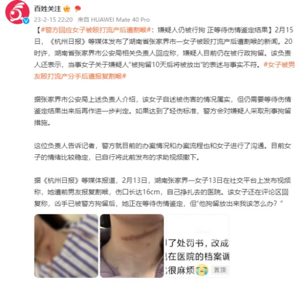 2月15日,《杭州日报》等媒体发布了湖南省张家界市一女子被殴打流产后遭割喉的新闻。20时许,湖南省张家界市公安局相关负责人回应称,嫌疑人目前仍在被行政拘留。该负责人还表示,当事女子关于嫌疑人“被拘留10天后将被放出”的表述与事实不符。