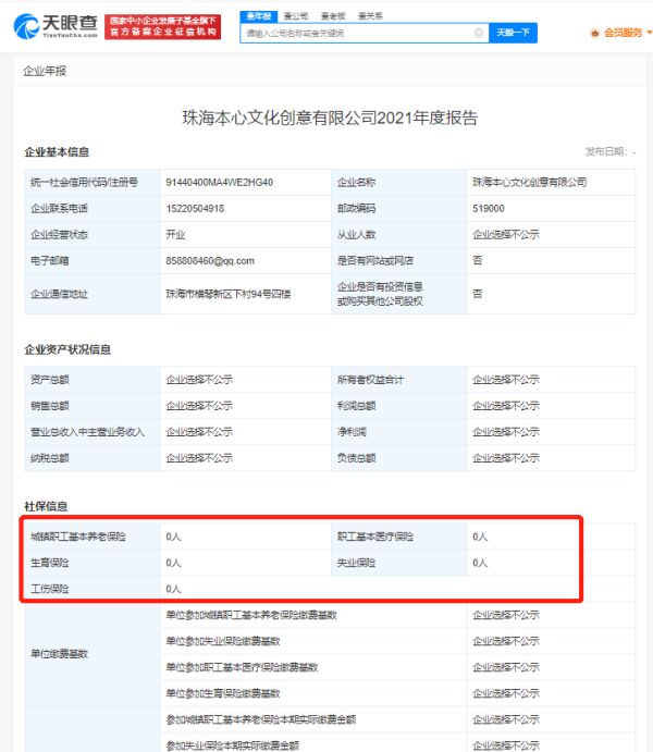据悉,鹿晗品牌关联公司为珠海本心文化创意有限公司,但是鹿晗本人并未在其潮牌关联公司珠海本心文化创意有限公司任职或持股,该公司由高苏尧、杨帆共同持股,据悉,高苏尧为鹿晗好友。2021年年报显示,该公司参保人数为0。