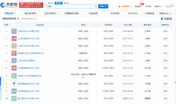 此外,天眼查App显示,鹿晗名下共关联12家企业,其中9家为存续开业状态,包括南京鹿晗影视文化工作室、上海方廷文化传播工作室、珠海鹿之梦文化创意有限公司等,版图涉及影视、传媒、文化创意等。其中由鹿晗持股50%并担任监事职位的珠海鹿之梦文化创意有限公司,还对外投资了珠海天空之陆数字科技有限公司、珠海天空之陆文化创意有限公司。值得一提的是,鹿晗本人并未在其潮牌关联公司珠海本心文化创意有限公司任职或持股,该公司由高苏尧、杨帆共同持股。