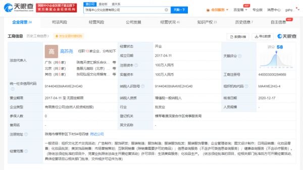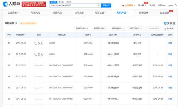 据悉,鹿晗品牌关联公司为珠海本心文化创意有限公司。天眼查App显示,珠海本心文化创意有限公司成立于2017年4月,法定代表人为高苏尧,注册资本100万人民币,经营范围包括组织文化艺术交流活动、广告制作、服饰研发、服饰制造、服装服饰批发、化妆品零售、互联网销售等。股东信息显示,该公司由高苏尧和杨帆分别持股75%、25%。2021年年报显示,该公司参保人数为0。该公司已申请注册多枚“UN GARCON CHARMANT”“U.G.C”商标,其中多枚商标已成功注册。