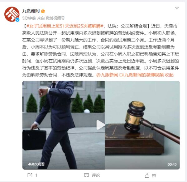 女子试用期上班51天迟到25次被辞退