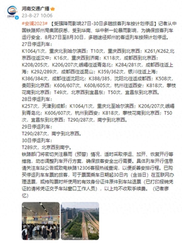 记者从中国铁路郑州局集团获悉,受到华南、华中新一轮暴雨影响,为确保旅客列车运行安全,8月27日至8月30日,多趟途经郑州的客运列车按照计划停运。