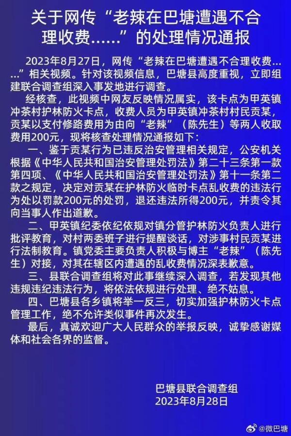 8月28日,甘孜州巴塘县融媒体中心发布关于网传“ 老辣在巴塘遭遇不合理收费……”的处理情况通报称,2023年8月27日,网传“老辣在巴塘遭遇不合理收费……”相关视频,针对该视频信息,巴塘县高度重视,立即组建联合调查组深入事发地进行调查。