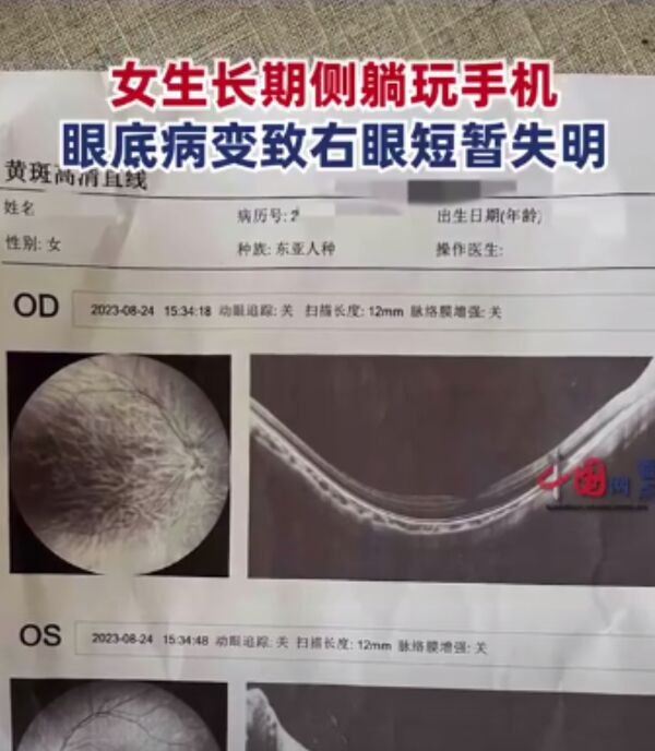 近日,在湖南张家界,一则新闻引起了广泛关注。一名女子因长时间侧躺玩手机,导致右眼短暂失明。然而,第二天早上,她的视力又奇迹般地恢复正常。经过医生诊断,发现该女子两边眼睛的眼底都出现了豹纹状病变。这一事件引发了人们对手机使用和眼睛健康的深度思考。