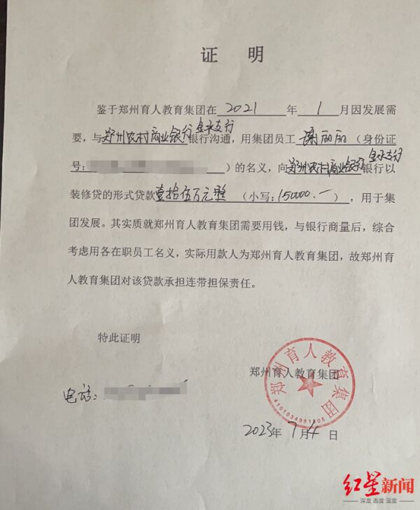 大多数人贷款将在2023年底和2024年初到期,若届时育人集团不能偿还,将会影响更多人。为此,背负贷款的员工们非常不安。今年7月,谢丽丽再次要求育人集团开具了书面《证明》以证明15万元装修贷的存在。“其实质是郑州育人教育集团需要钱,与银行商量后,综合考虑用各在职员工的名义,实际用款人为郑州育人教育集团,故郑州育人教育集团对该贷款承担连带担保责任。”