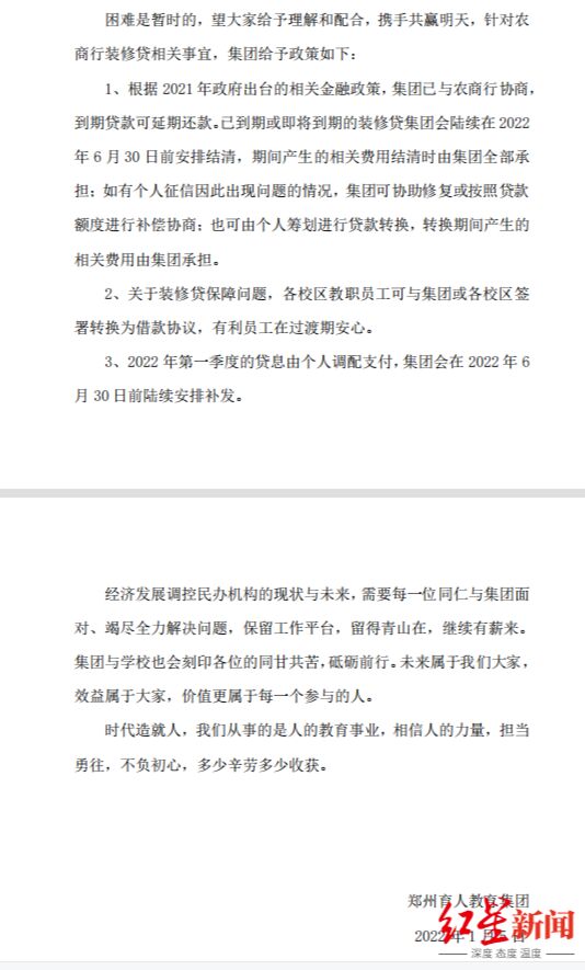 员工们提供的两份《说明》证实了上述苗丽霞的说法。一份是2022年1月5日发布的《郑州育人集团关于农商行担保装修贷的相关说明》称,根据2021年相关金融政策,集团已与农商行协商,到期贷款可延期还款。已到期或即将到期装修贷款,集团会陆续在2022年6月30日安排结清,期间产生的相关费用结清时由集团全部承担。如果个人征信因此出现问题的情况,集团可协助修复或按照贷款额度进行赔偿协商;也可有个人筹划进行贷款转换,转换期间产生的相关费用由集团承担。2022年第一季度的贷息由个人调配支付,集团会在2022年6月30日前陆续安排补发。