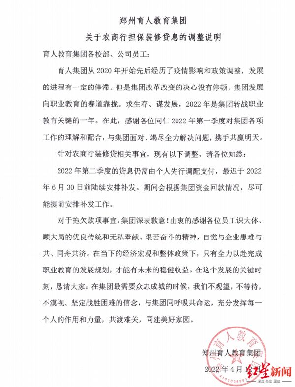 一份是2022年4月12日发布的《郑州育人教育集团关于农商行担保装修贷息的调整说明》,称2022年第二季度的贷息仍需由个人先行调配支付,最迟于2022年6月30日前陆续安排补发。