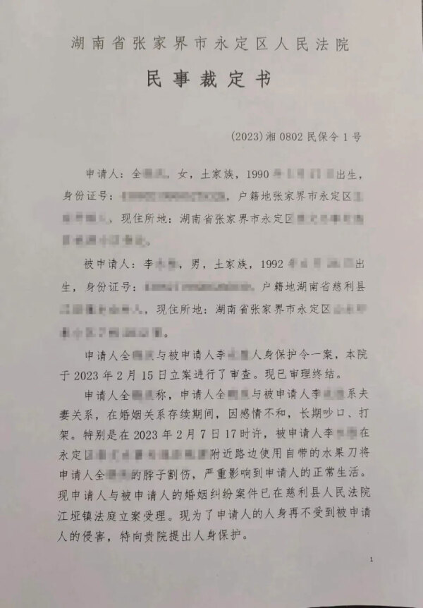 导读:近日,张家界一女子被丈夫割喉。据永定区人民法院消息,2月15日16:30左右,张家界永定区人民法院依法审查,发出对该女子的人身安全保护令。