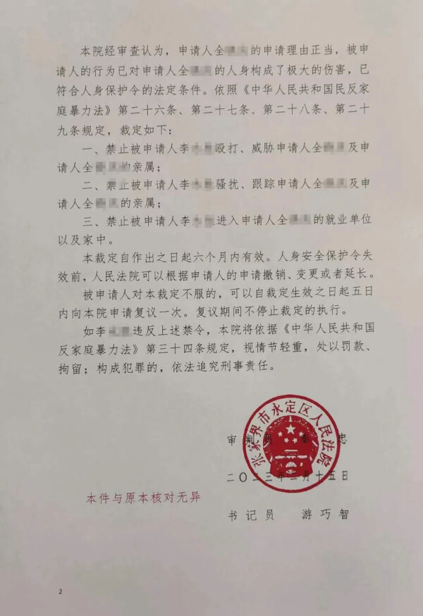 据湖南省张家界永定区人民法院官微“永定区人民法院”2月16日消息,2023年2月15日16:30左右,张家界市永定区人民法院依法高效审查,发出2023年首份人身安全保护令。