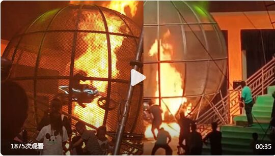 8月29日,山西晋中。乌金山狂欢谷,大马戏团演员骑摩托表演“铁笼飞车”时笼内起火,周围观众惊呼尖叫。