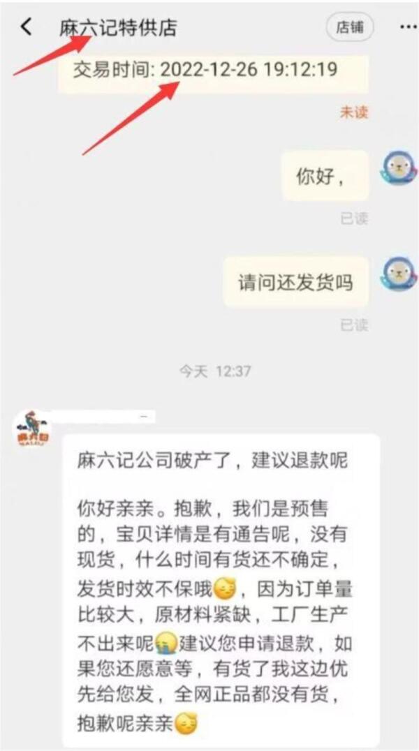 网传信息显示,该网友晒出了与客服的聊天记录,下单时间是2022年12月26日。该网友问:请问还发货吗?店家回应:麻六记公司破产了,建议先退款。对方透露,他们是预售的商品不知道有没有现货,发货的时间没有保障,因为订单多,原材料紧缺,工厂生产不出来。