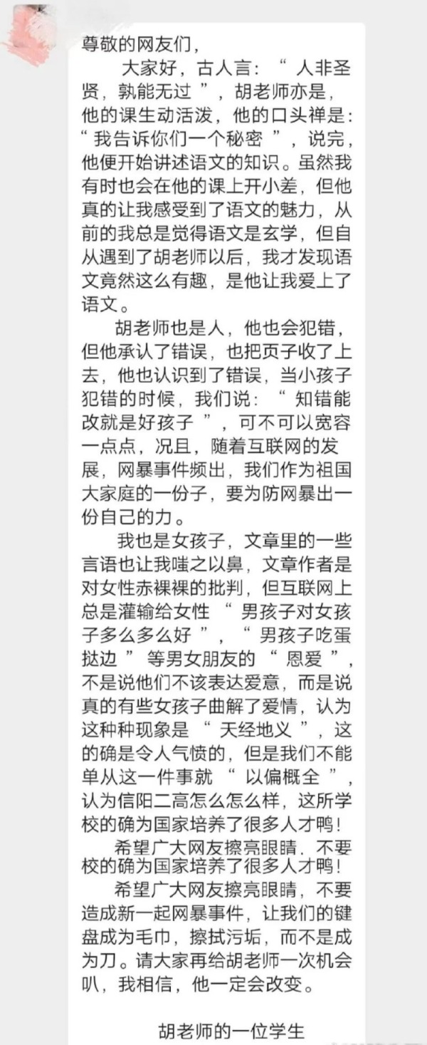 九派新闻记者观察到,30日晚,一名疑似信阳市二高学生在微博发文,称“转一篇同学的文章,不是想掩盖错误,而是想让大家知道胡老师并非大家所言如此不堪,希望大家给他一个改正的机会。”