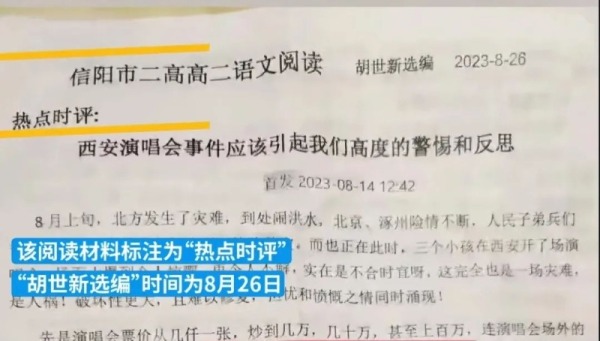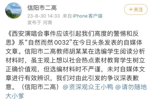 30日下午,名为“信阳市二高”的微博账号发布消息称《西安演唱会事件应该引起我们高度的警惕和反思》系自媒体文章。