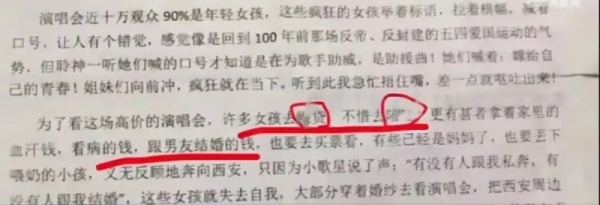 网传图片显示,一篇标题为《西安演唱会事件应该引起我们高度的警惕和反思》的文章,内含“许多女孩为看高价演唱会去裸贷、去陪睡”“花看病的钱,跟男友结婚的钱,也要去买票看”等内容。