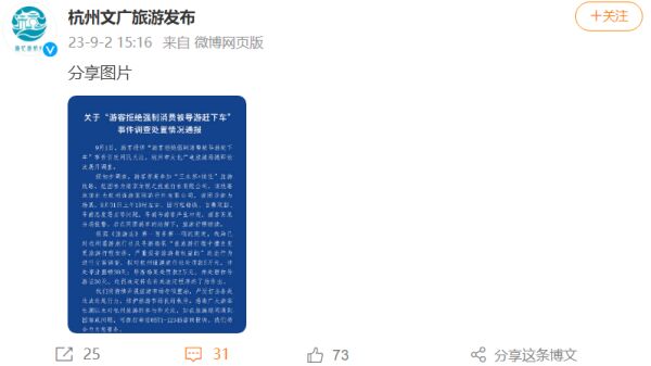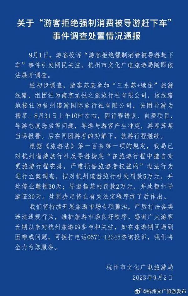 9月1日,游客投诉“游客拒绝强制消费,被导游赶下车”事件引起网民关注,杭州市文化广电旅游局随即依法展开调查。