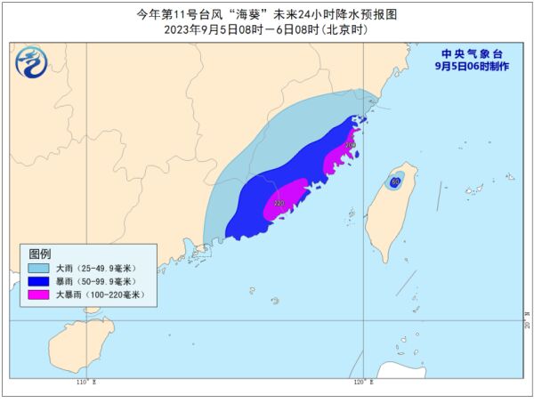 降水预报:9月5日08时至6日08时,福建大部、广东东部、江西东南部、浙江南部、台湾岛西北部等地部分地区有大到暴雨,其中,福建东部、广东东南部等地部分地区有大暴雨(100-220毫米)。上述部分地区伴有短时强降水(最大小时降雨量30-50毫米,局地可超过70毫米),局地有雷暴大风等强对流天气。