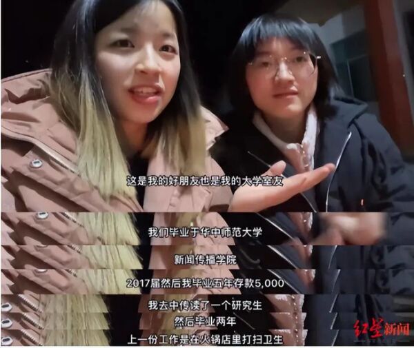 据了解,视频主人公弯弯和超超毕业于华中师范大学。毕业5年期间,一个曾经在互联网大厂工作,现在存款只有五千多。另一位在中国传媒大学读了研究生,梦想是成为一名编剧,结果一路碰壁,她上一份工作是一家火锅店的服务员。