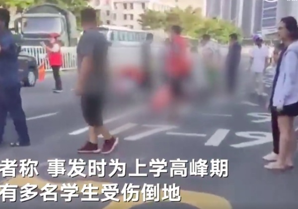 目击者称,事发时是上学高峰期,事发地就在学校门口斑马线上,当时司机车速较快,现场有多名学生受伤倒地。“大概四五个孩子被撞,在斑马线,他没有减速”。