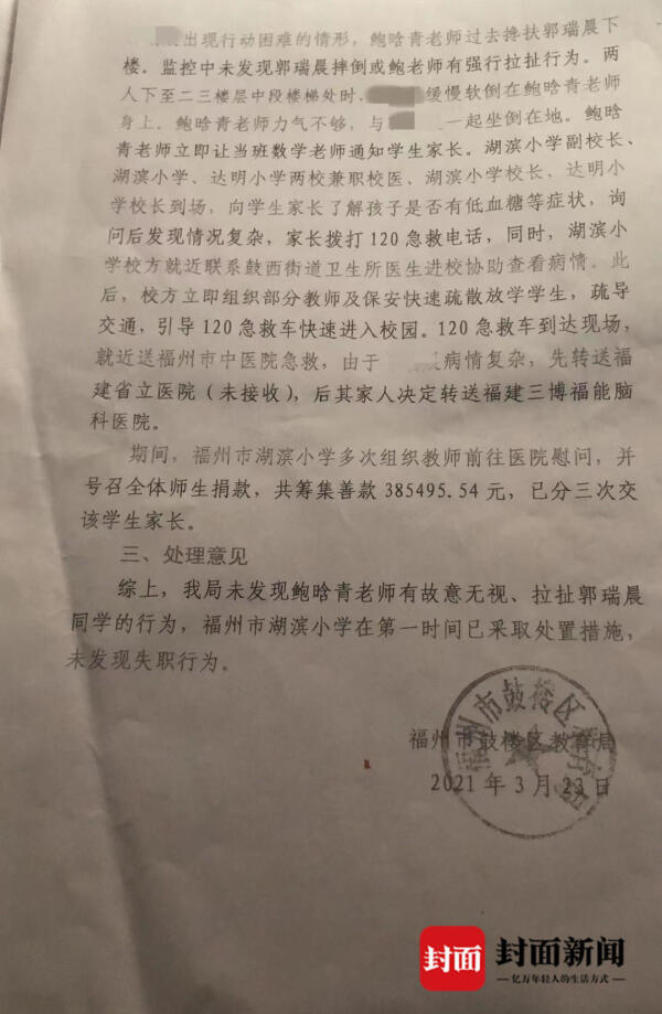 2021年3月,福州市鼓楼区教育局曾出具书面调查结论称,未发现老师有故意无视、拉扯小晨的行为,学校在第一时间已采取处置措施,未发现失职行为。
