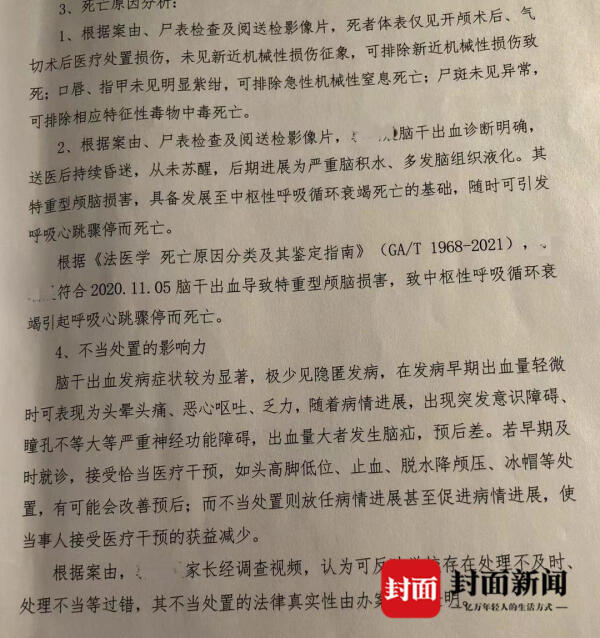 法庭上出具的司法鉴定认为,脑干出血发病后如果及时就诊可改善,不当处置则会放任甚至促进病情进展,使当事人接受医疗干预的获益减少。福建省立医院神经内科主任医师出庭陈述称,影像学没有发现小晨有明显外伤;神经元能多一分钟多一秒钟的抢救时间,都能挽救大量的脑组织、阻止损害继续扩大,脑部的损害治疗都是争分夺秒。