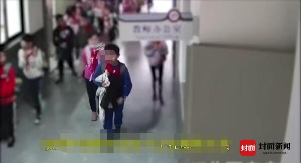下课后,小晨背着书包抱着外套和同学一起离开教室,在走廊上露出痛苦和哭泣表情。之后老师走过来,搀着小晨一侧胳膊下楼,小晨出现腿脚发软、踩踏楼梯无力的状态。视频可以看到,在楼梯间拐弯处,有学生突然受惊吓跑开。之后,小晨的父亲从楼梯进入画面。但画面未拍到拐角处的情况。