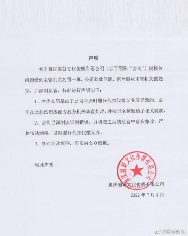 据报道,演员@袁冰妍 关联公司重庆丽妍文化传媒有限公司因违反税收管理法,被国家税务总局重庆市税务局第七稽查局罚款约97.80万元。7月4日,袁冰妍工作室声明称,关于税务机关作出的处罚,公司深刻反省,并积极配合整改。公司目前已及时缴纳款项,向公众致歉。