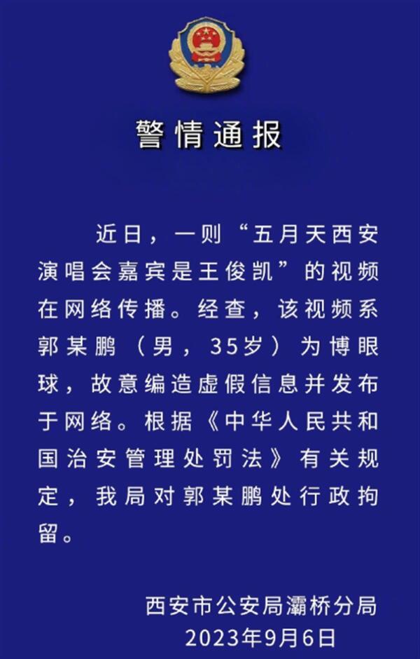 6日,西安警方发布警情通报称,经查,该视频系郭某鹏(男,35岁)为博眼球,故意编造虚假信息并发布于网络。根据《中华人民共和国治安管理处罚法》有关规定,警方对郭某鹏处行政拘留。
