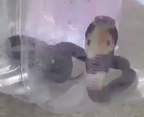 相关视频显示,夜晚,有人将抓到的几条蛇放进瓶子里。有人说道:“今天晚上抓到4条眼镜蛇。为了村民,我们也是加班加点(抓)。”