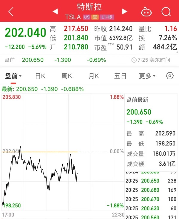 当地时间2月16日,美股三大指数收盘显著下跌。道指跌1.26%,标普500指数跌1.38%,特斯拉(TSLA)大跌5.69%,报202.04美元,市值蒸发386亿美元(折合人民币约2648亿元)。截至发稿前,特斯拉盘前股价下跌0.688%。