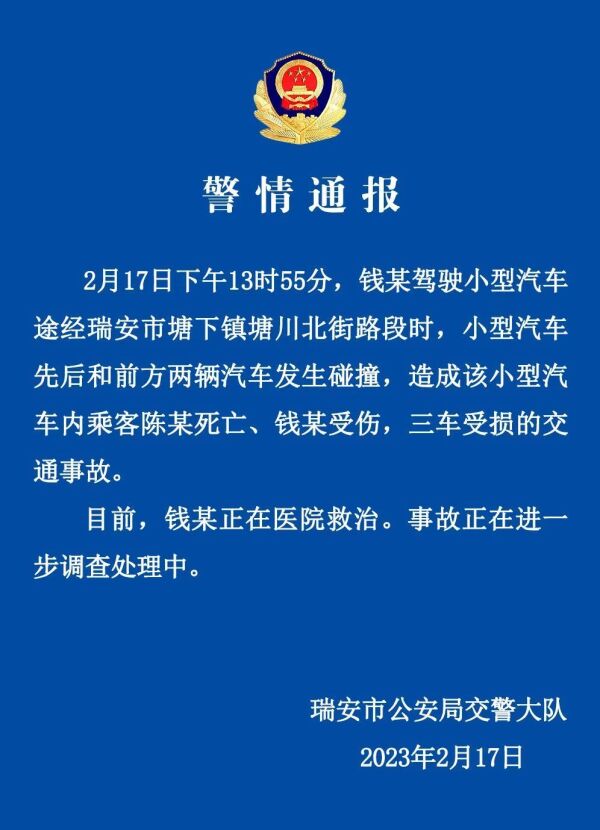 17日晚,警方通报,2月17日下午13时55分,钱某驾驶小型汽车途经瑞安市塘下镇塘川北街路段时,小型汽车先后和前方两辆汽车发生碰撞,造成该小型汽车内乘客陈某死亡、钱某受伤,三车受损的交通事故。目前,钱某正在医院救治。事故正在进一步调查处理中。