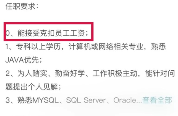 导读:近日,四川成都一网友发文称,某公司在任职要求中注明,“能接受克扣员工工资”,引起广泛关注。