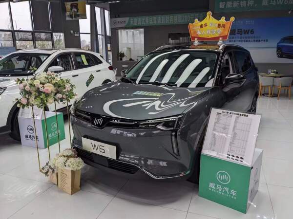 黄冈威马用户中心旗舰店摆放的威马W6。时代财经 摄