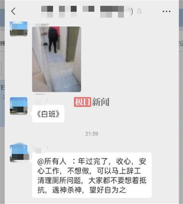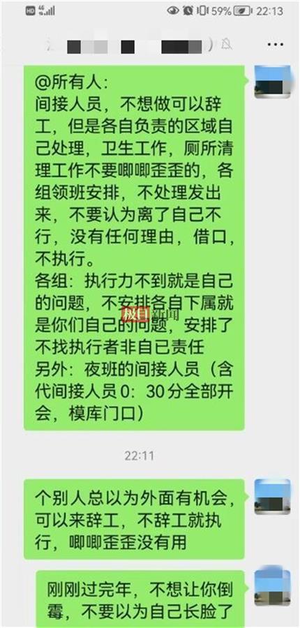 “间接人员,不想做可以辞工,但是各自负责的区域自己处理,厕所清理工作不要唧唧歪歪的。”上述领导还称:“年过完了,收心安心工作,不想做,可以马上辞工。清理厕所问题,大家都不要想着抵抗,遇神杀神,望好自为之。”