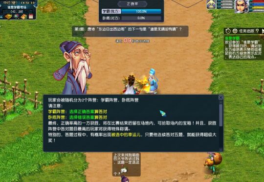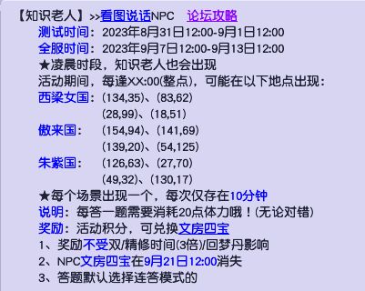 本次教师节活动共有3个答题场景,每个场景均有4个答题点,知识老人会在每个整点出现在3个场景中随机1个答题点上。由于傲来国、朱紫国可以定导标旗,在找寻知识老人位置时有天然优势,对于追求效率的小伙伴来说非常不错,另外对于多开小伙伴来说,通过更换队长的方式答题会比散开答题的效率要高,还不影响答完题继续刷任务。