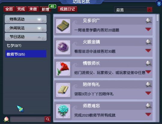 2023年教师节活动共有蒙学夫子、看图说话、谁是学霸、师徒情深等四类任务,没有常规活动中的环任务、小副本和挑战任务。所以,大家只要答题兑换文房四宝就可以获得不错的收益。