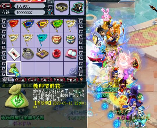 除此之外,教师节活动期间首次登录游戏将会获得一枚教师节鲜花的种子,在特定场景种下后可将收获的鲜花送给门派师父,也可以送给自己往昔的的师父、徒弟,必得经验和钱,有概率获得道具。