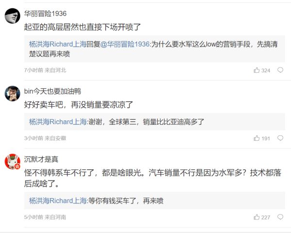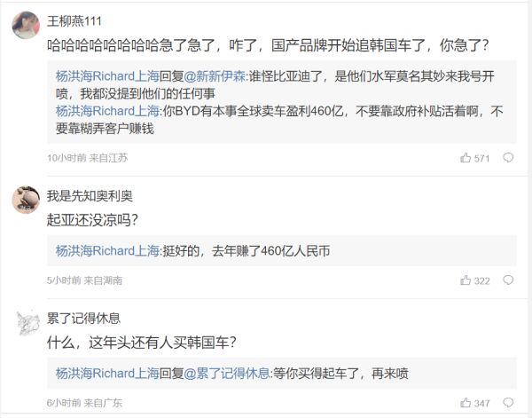 此外,面对网友“起亚还没凉吗”“这年头还有人买韩国车”等质疑,杨洪海也一一“回怼”道,“挺好的,(起亚)去年赚了460亿人民币”“等你买的起车了,再来喷”。