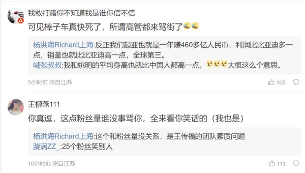 “王传福,请教育好你的团队,水军也需要将(讲)素质,你说我们是棒子车,请先反思一下你的产品?BYD品牌名字好听吗?不就是一句骂人的话吗?哪天你的产品能不在大街上自燃?何时你能标真实里程数?何时你可以不弄虚作假?何时中国海关乘用车出口数据第一名是你?”杨洪海在个人社交媒体上称。