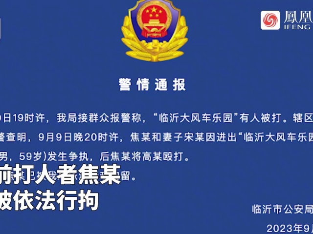 9月10日,有网友爆料称,山东临沂一大风车乐园内有夫妻二人与门卫发生争执。视频画面显示,门卫被左右开弓狂扇面部。9月11日,临沂兰山公安发布通报称,事发在9月9日晚,目前打人者焦某已被依法行拘。