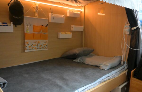 在新店,男生住4人间,卧室有两张上下铺。剩下的两个卧室则是女生房,各放着一张上下铺,都是双人间。根据房型不同,每月的房费也有2100元和2500元两档。