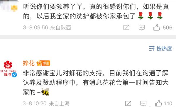 3月8日,有网友在上海蜂花日用品有限公司官方微博@蜂花 评论区咨询:听说你们要领养(大熊猫)丫丫,真的很感谢你们。