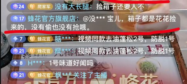 对此,蜂花在直播间回应称“箱子都是花花捡来的,没有偷也没有抢哦。”