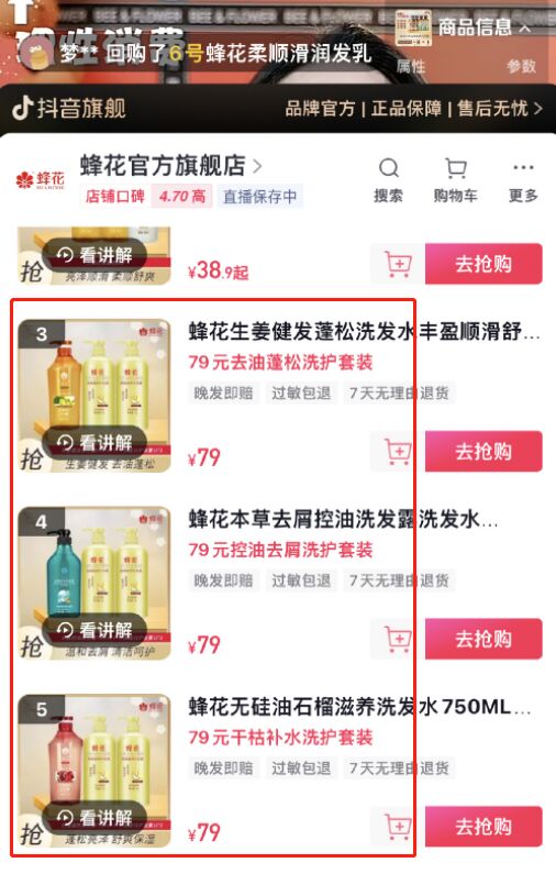 9月11日晚,在抖音蜂花直播间,主播连夜上架了3款79元洗护套装,并称“79元可以买5斤半”,这三款套装均包括相同的2瓶1L的护发素和1瓶750ML不同功效的洗发水。