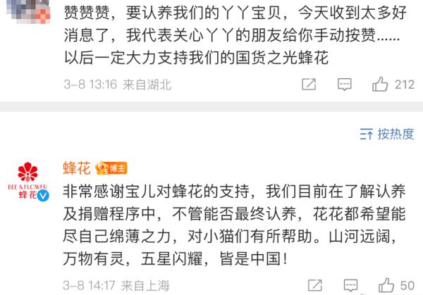 对此,@蜂花 回应称:目前我们在沟通了解认养及赞助程序中,有消息花花会第一时间告知大家的。