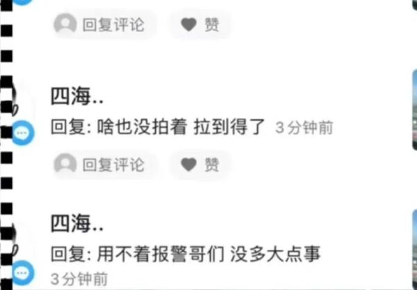 据视频发布者张先生介绍,视频传到网络后,有疑似拍摄者在视频下方留言称:啥也没拍到,没多大事。目前,张先生已经报警。