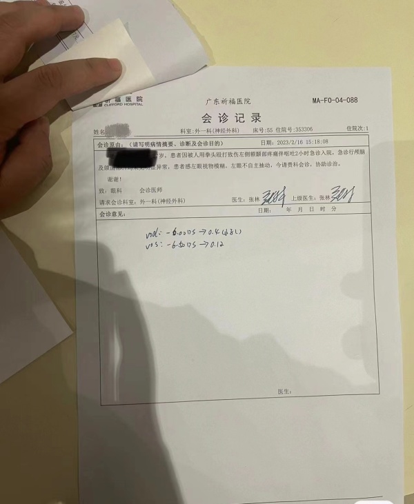 随后,杨先生到广东祈福医院就诊。会诊记录显示:“患者因被人用拳头殴打致伤左侧额颞部疼痛伴呕吐2小时急诊入院,急诊行颅脑及颌面部CT均未见明显异常,患者感左眼视物模糊,左眼不自主抽动。”