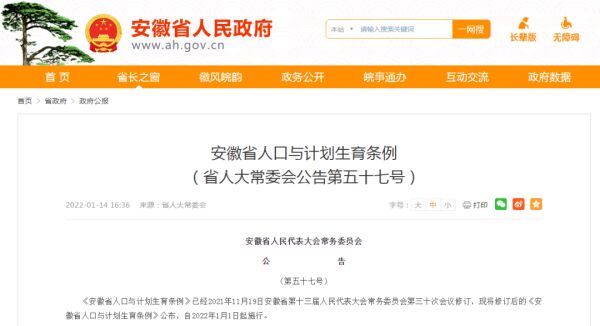 《安徽省人口与计划生育条例》自2022年1月1日起施行。