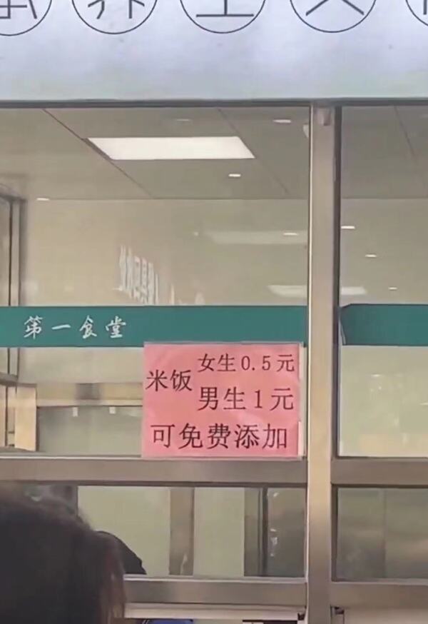 近日,有网友在社交平台发布视频称,福建电力职业技术学院食堂内,档口贴有“米饭女生0.5元男生1.0元”的告示,该网友质疑这一定价标准是否为性别歧视。